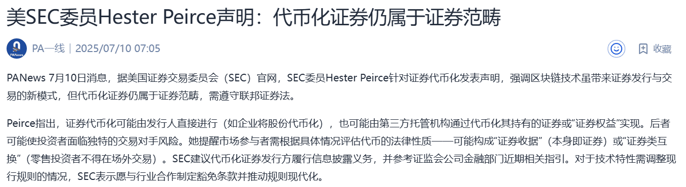 Interprétation de Tang Seng : Bien que Peirce soit connue pour son attitude ouverte, cette déclaration ferme complètement la porte à l'illusion que les "titres en chaîne" peuvent échapper à la régulation. Les coûts de conformité des projets RWA explosent, et les petites et moyennes équipes pourraient être nettoyées !