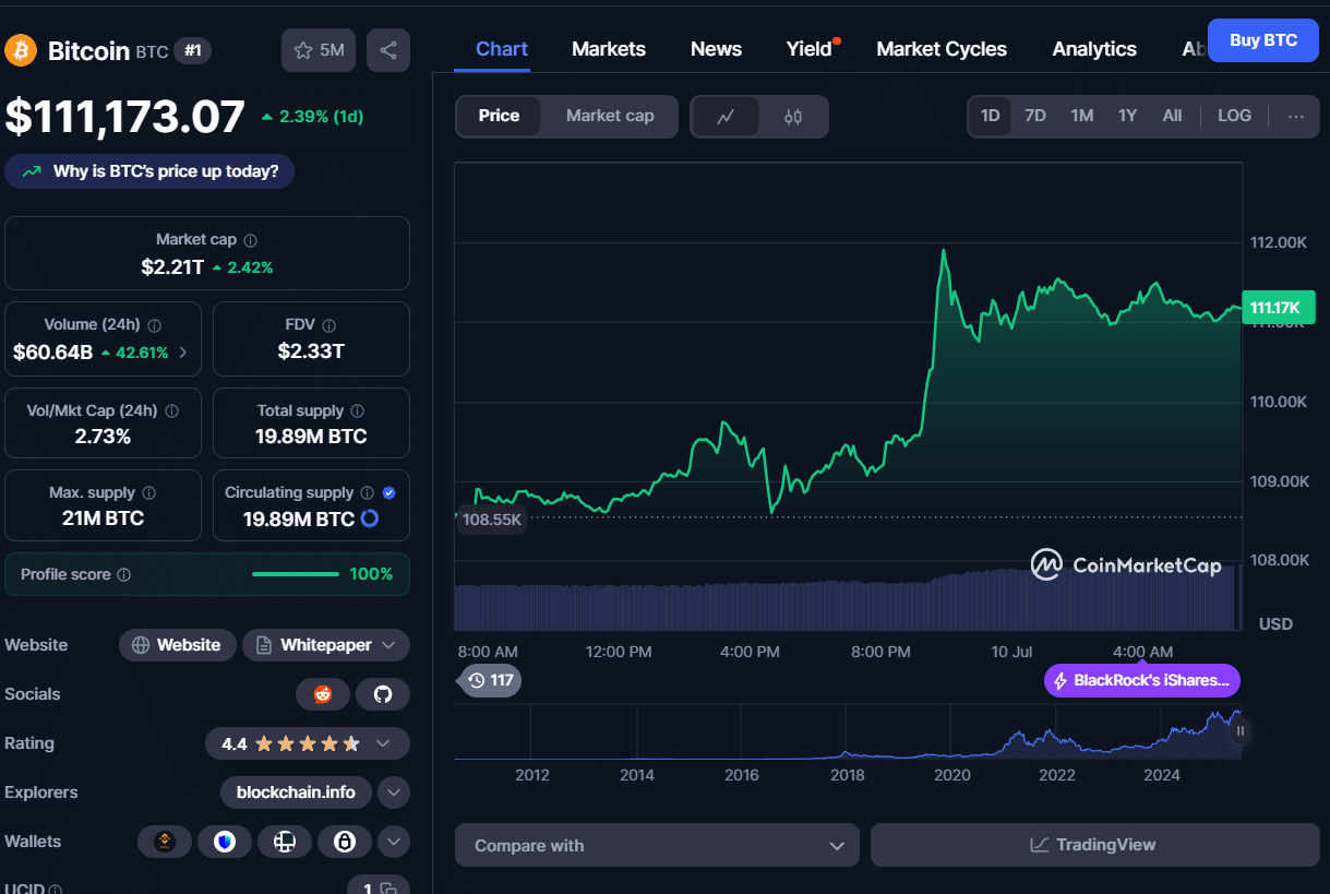 Le prix de Bitcoin a atteint un niveau record de 112 000 $ sur la plateforme Binance à 3h43 UTC le 10 juillet (CoinoMedia), dépassant la résistance précédente de 111 963 $. Cet exploit technique a activé des ordres d'achat automatiques et a augmenté le sentiment de peur de manquer une opportunité (FOMO) parmi les traders qui s'attendaient à une nouvelle phase de découverte des prix.