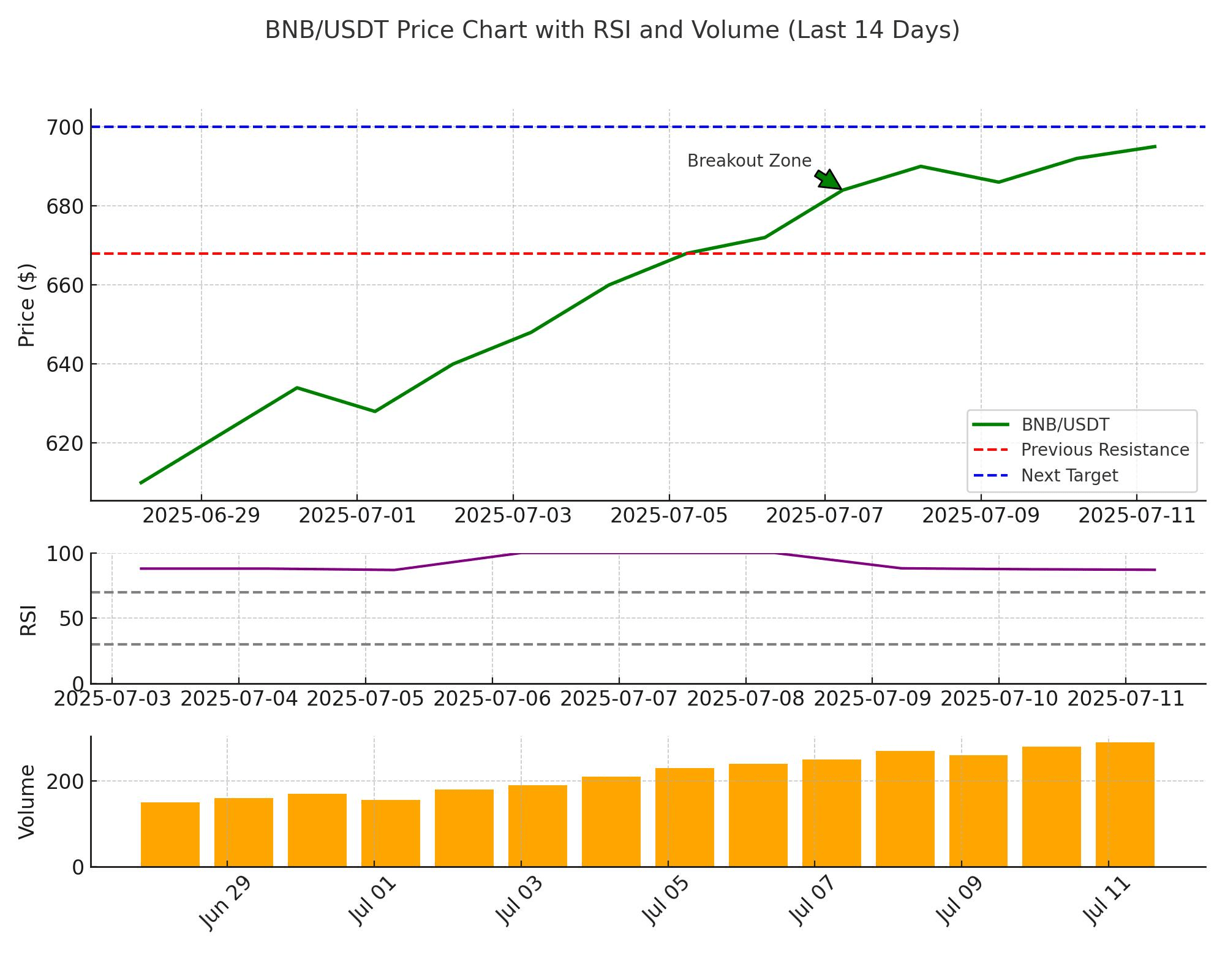 BNB montre un sérieux élan aujourd'hui, se négociant autour de 690 $ et se dirigeant vers le niveau psychologique clé de 700 $. Avec une continuation haussière depuis la zone de rupture de 668 $, ce mouvement n'est pas juste une hype — il est soutenu par de solides fondamentaux et des signaux on-chain.
