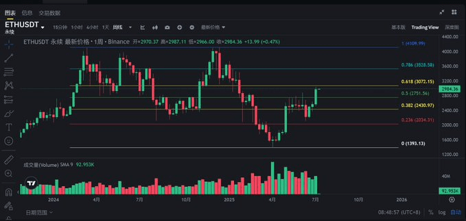 3)L'ETH a augmenté jusqu'à la zone de forte résistance de 0,618, soit environ 3050, mais menée par le BTC, cette zone de résistance sera tôt ou tard franchie ;