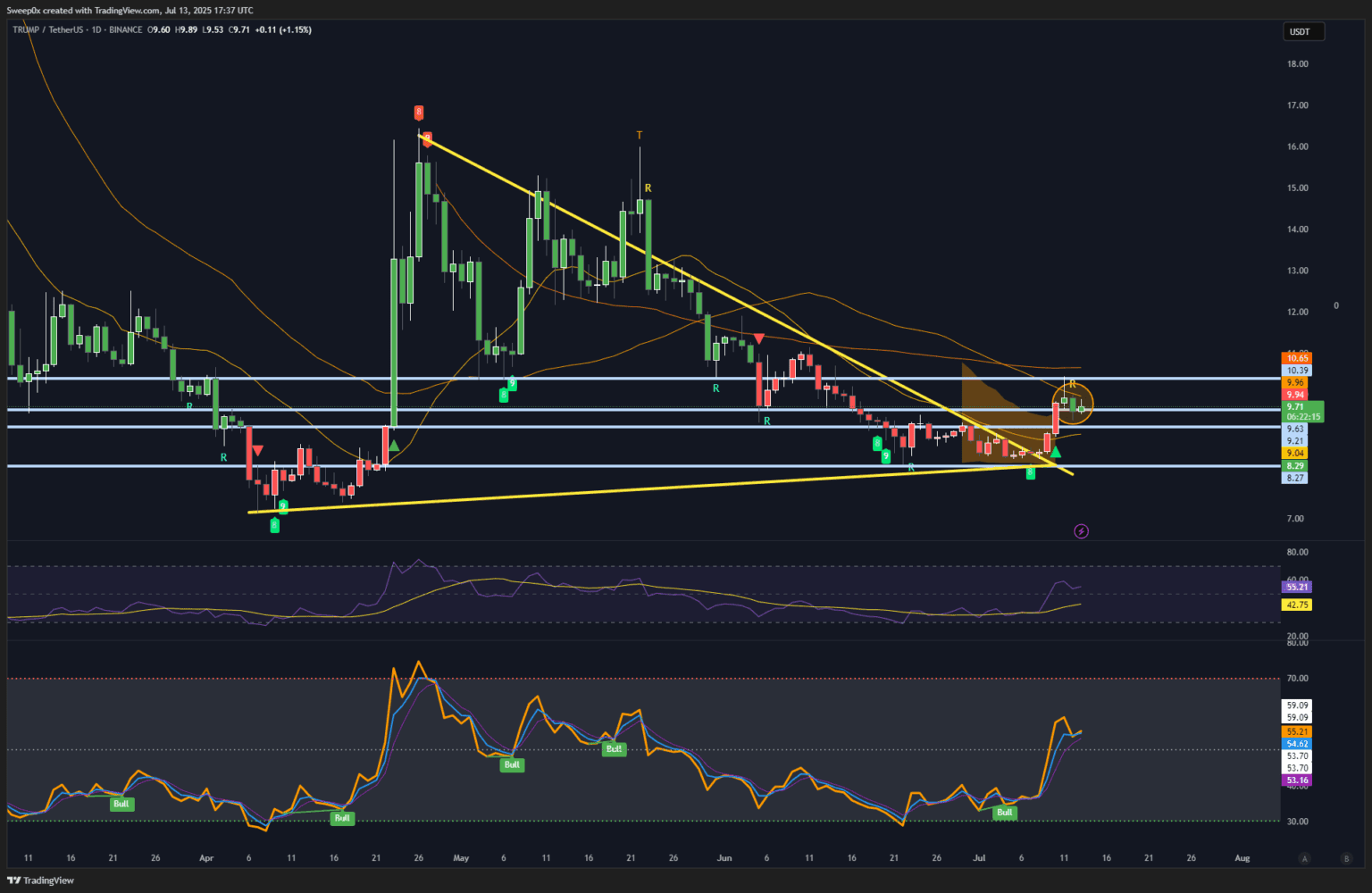 Il convient de mentionner que ce déverrouillage coïncide également avec la Semaine de la Crypto. Au moment de la presse, le TRUMP se négocie à 9,79 $, enregistrant une augmentation d'une semaine allant jusqu'à 11%.