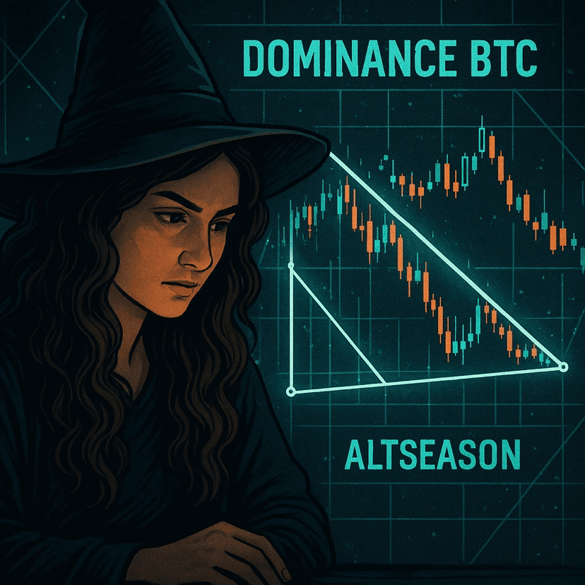 Une formation triangulaire inversée est apparue, comme un sceau cabalistique, juste au seuil de 53 %. Si elle casse vers le haut, elle pourrait de nouveau absorber l'âme des memecoins. Si elle tombe… les altcoins voleront comme des corbeaux libérés.