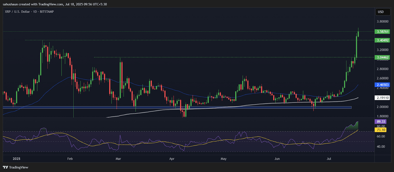 XRP a pulvérisé son record ATH en atteignant 3,665 $, marquant une augmentation de 20 % au cours des dernières 24 heures.