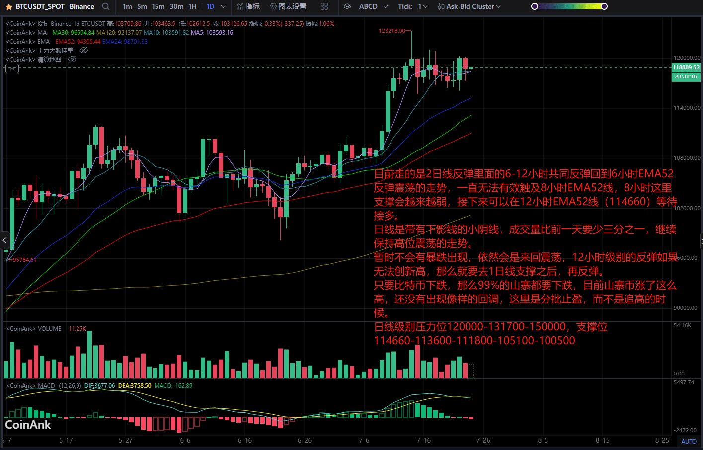 Actuellement, nous observons un rebond en 2 jours dans lequel les 6-12 heures rebondissent ensemble vers le mouvement de rebond et d'oscillation de la 6 heures EMA52, n'ayant toujours pas réussi à atteindre efficacement la ligne EMA52 de 8 heures. Le support ici à 8 heures deviendra de plus en plus faible, il est donc possible d'attendre d'acheter près de la ligne EMA52 de 12 heures (114660).