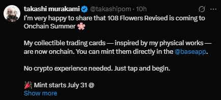 Il dit que ces cartes virtuelles sont inspirées de son œuvre d'art physique emblématique connue pour ses fleurs colorées et souriantes et ses designs de style anime. Il utilise la blockchain Base pour rendre le processus de minting moins coûteux et plus respectueux de l'environnement.