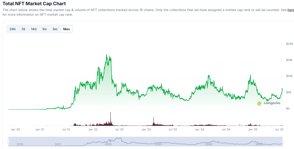 Après une longue période de silence, le marché des jetons non fongibles fait son retour. Selon des données récentes, la capitalisation boursière totale a grimpé à environ 6 milliards de dollars avec un pic récent de 6,6 milliards de dollars le 22 juillet, ce qui double la taille par rapport à avril, selon CoinGecko.