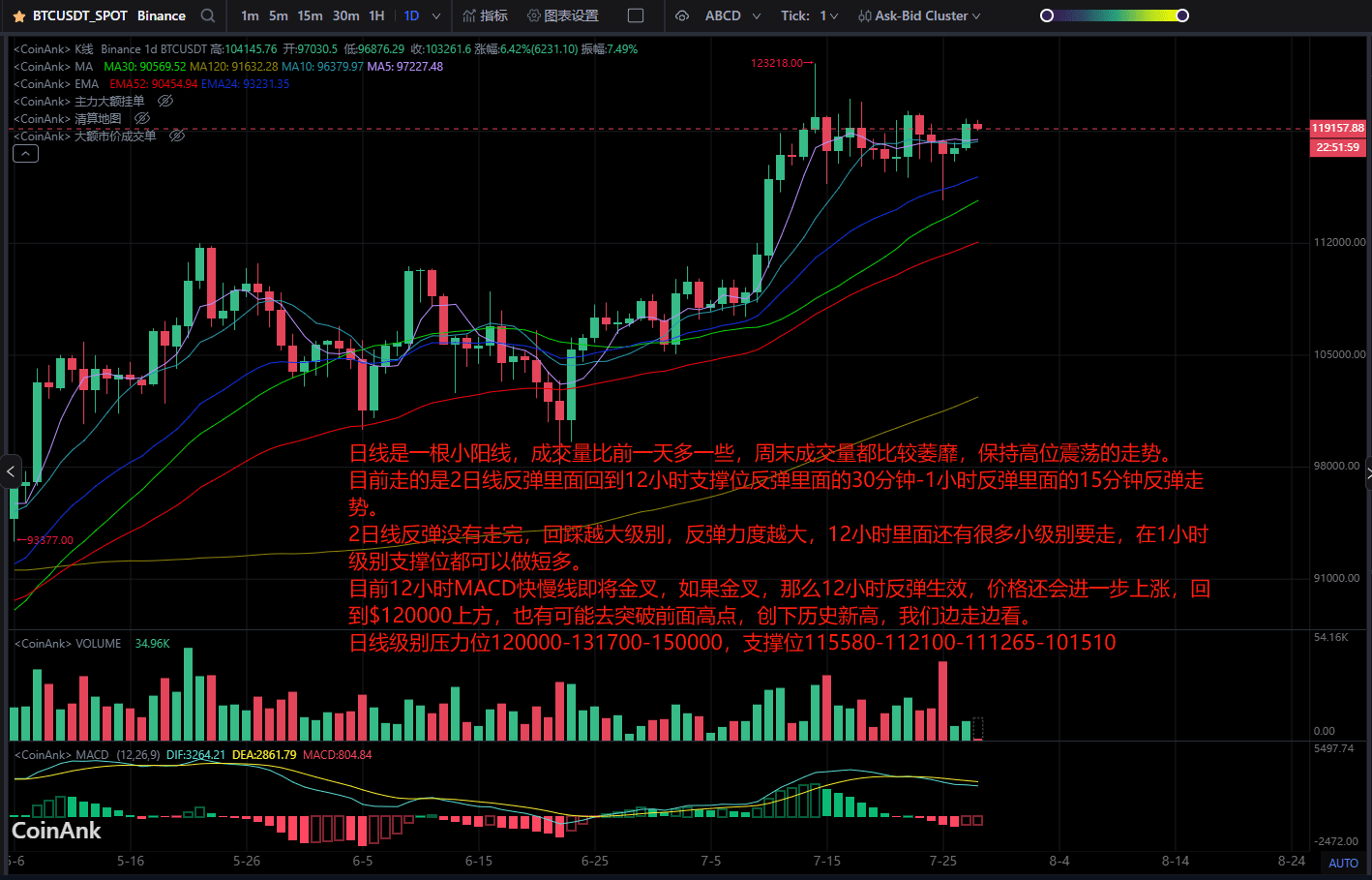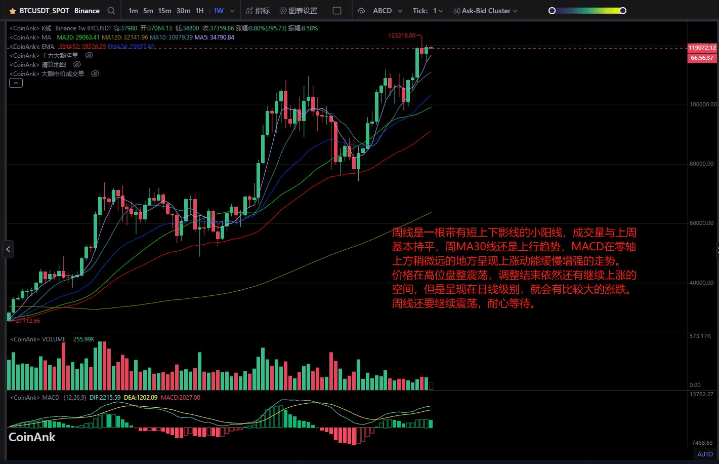 Actuellement, les lignes rapides et lentes du MACD à 12 heures vont bientôt former un croisement doré. Si le croisement doré se produit, le rebond à 12 heures sera effectif, et le prix continuera probablement à augmenter, revenant au-dessus de 120000 $, avec une possibilité de dépasser les sommets précédents et d'établir un nouveau record historique. Nous observerons la situation.