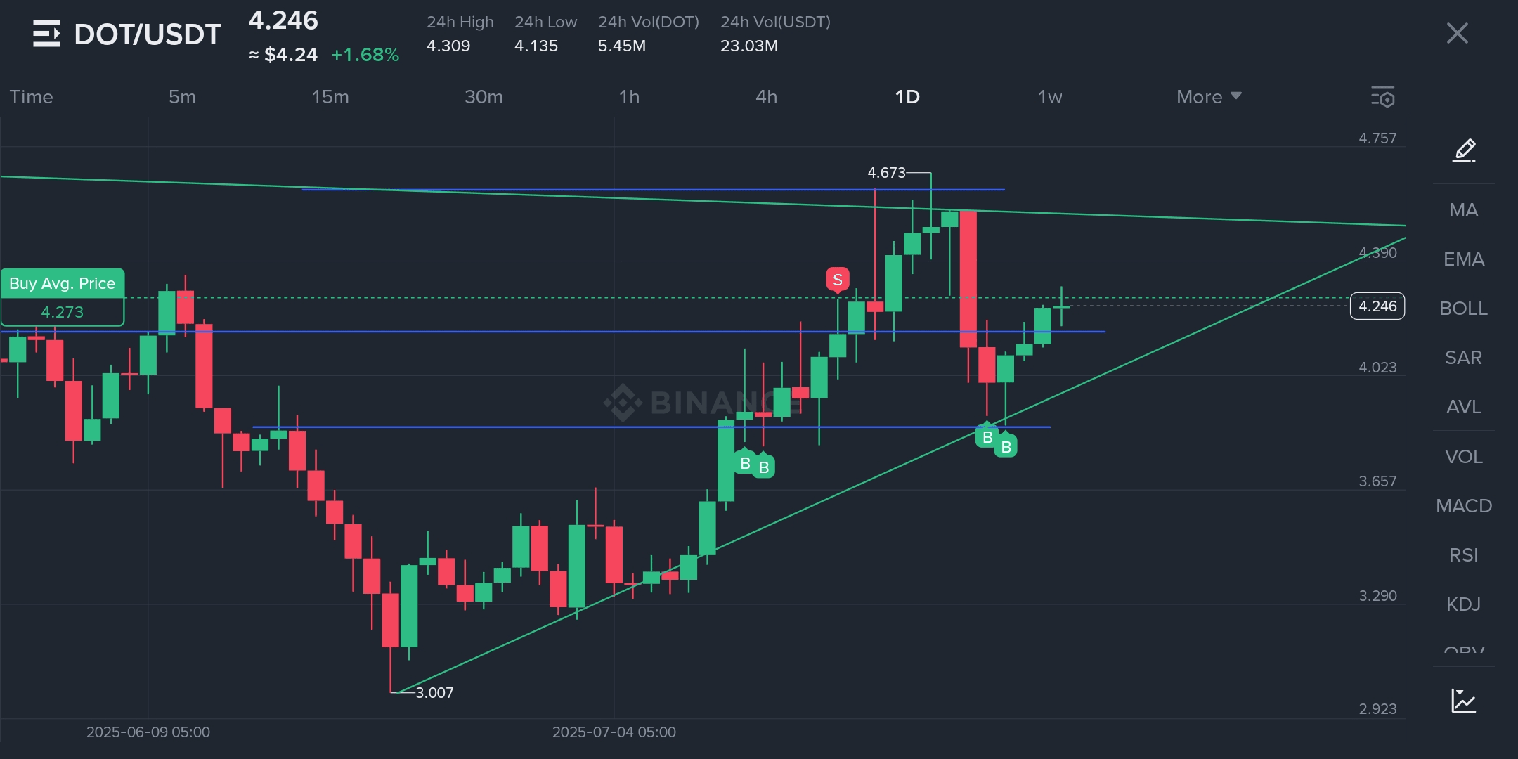 * **200 EMA:** DOT tente de rĂ©cupĂ©rer cela â haussier s'il clĂŽture au-dessus pendant 3 jours
