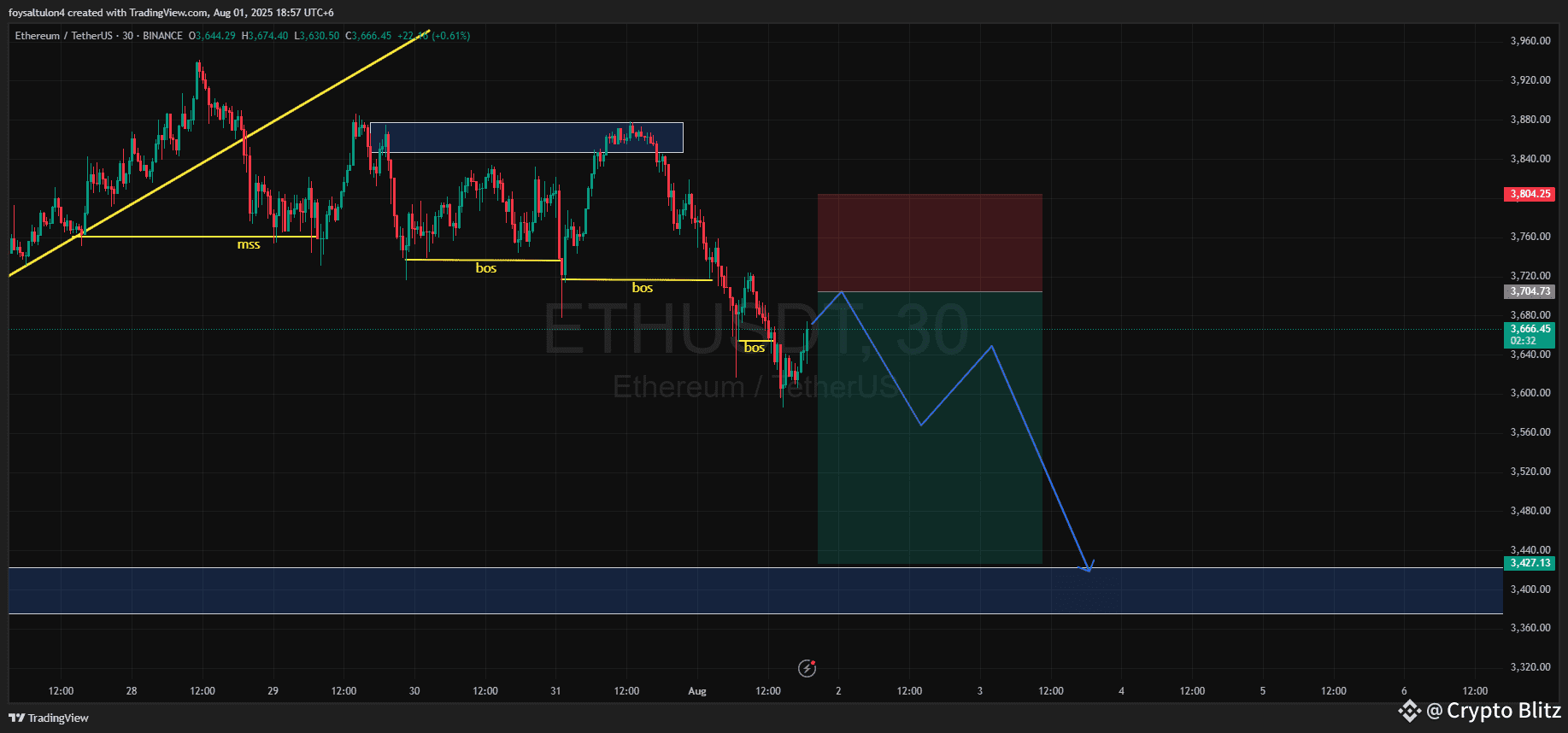 Le marché montre un changement de structure clair (MSS), suivi de plusieurs ruptures de structure (BoS), confirmant un retournement de haussier à baissier.