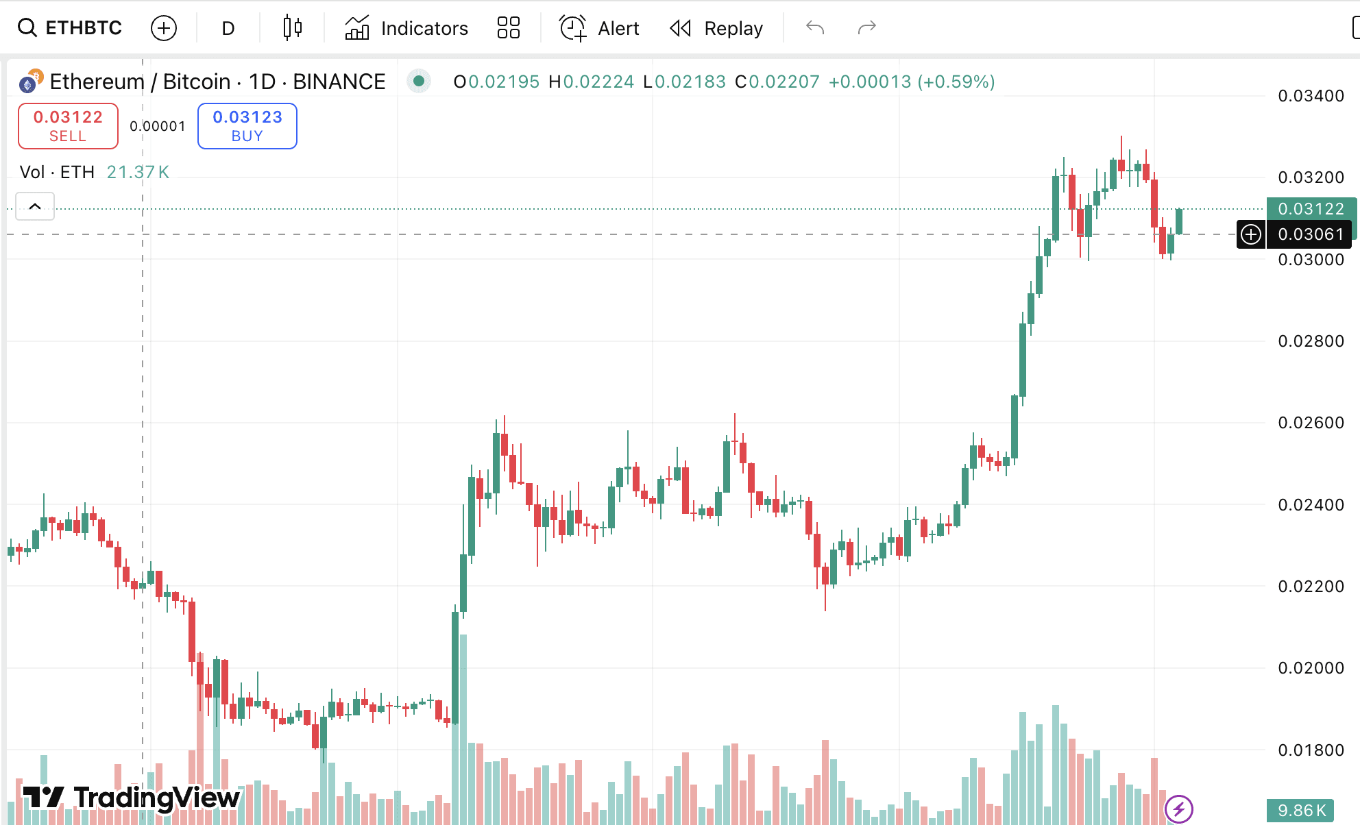 Ce que c'est : le ratio ETH/BTC suit la force d'Ethereum par rapport à Bitcoin. Cela signale que le marché est prêt à jouer avec plus de levier.