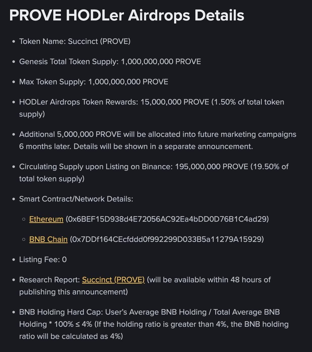 Binance lance son 31ème airdrop HODLer avec 15 millions de jetons PROVE pour les détenteurs de BNB éligibles, aucune action n'est nécessaire en dehors du staking passé.