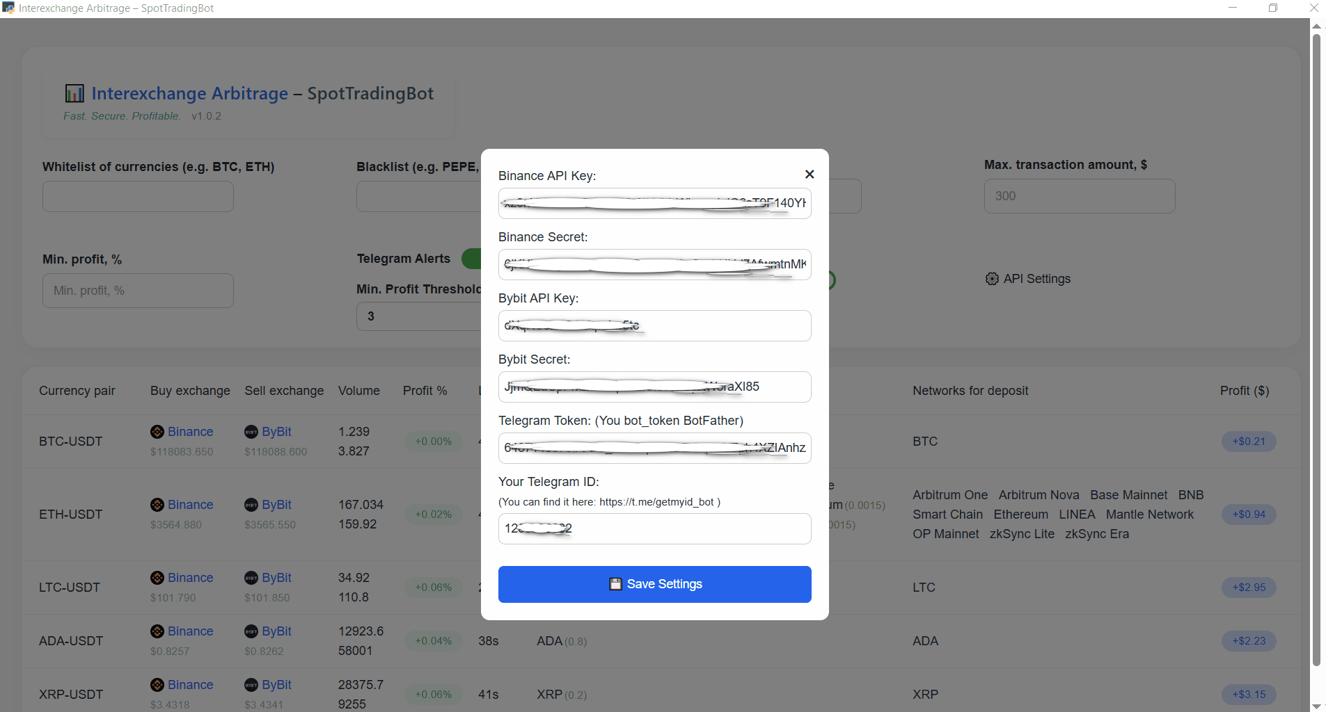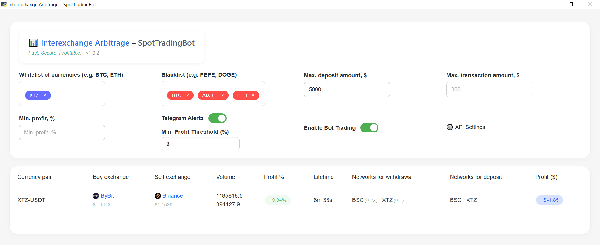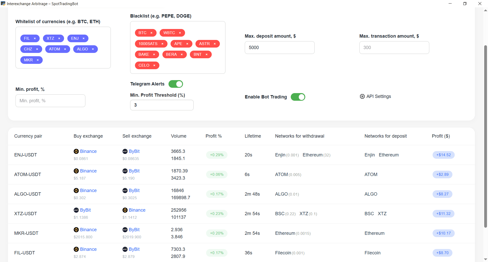 SpotTradingBot est un bot de trading automatisé avancé conçu pour l'arbitrage spot en temps réel entre deux des principales plateformes d'échange de cryptomonnaies au monde : Binance et ByBit. Conçu pour la vitesse, la précision et la rentabilité, il permet aux traders de tirer parti des inefficacités de prix entre les échanges et de générer des profits avec un minimum d'implication manuelle.