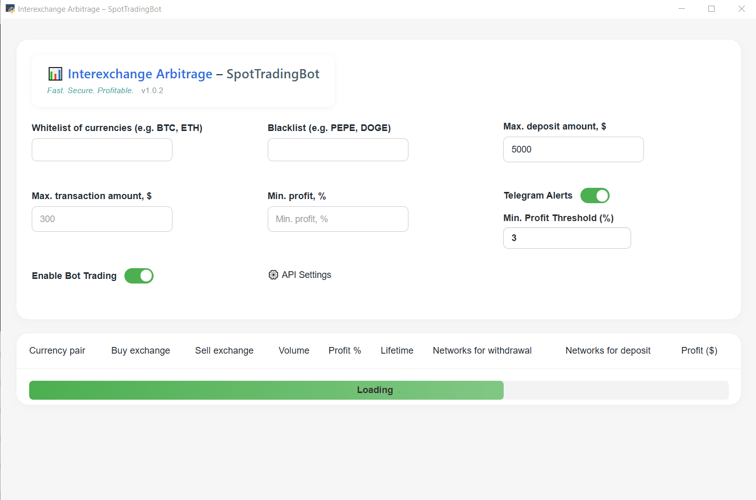 SpotTradingBot propose un tableau de bord complet d'arbitrage avec :
