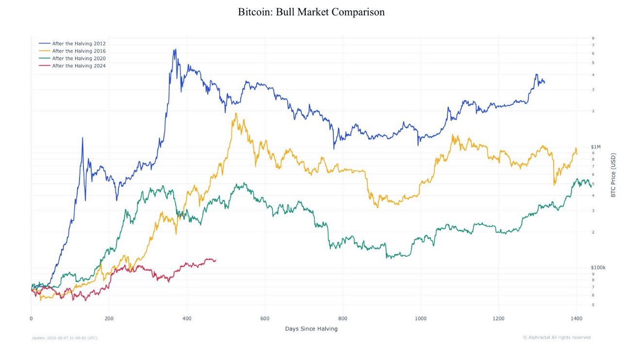 Nous sommes encore au début du cycle 2024, et historiquement, les plus grands gains se produisent 200 à 500 jours après le halving. Si l'histoire se répète ou même rime légèrement, le BTC pourrait entrer dans sa partie la plus forte de la course haussière au T4 2025 au T1 2026.