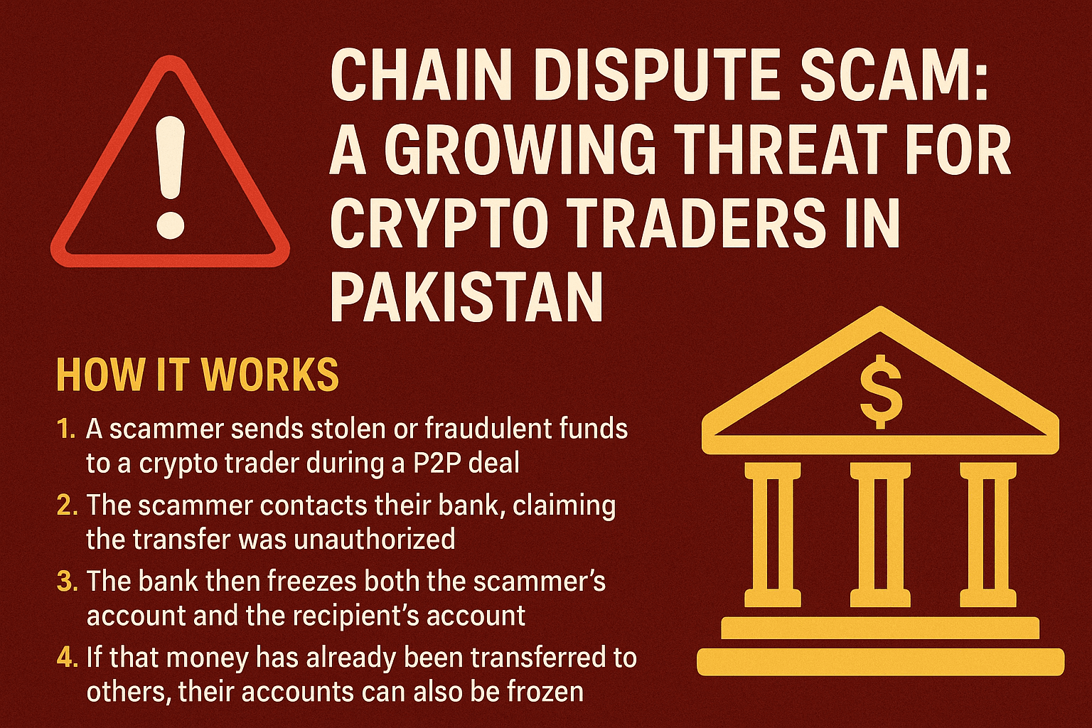 Les traders de cryptomonnaies au Pakistan sont confrontés à une nouvelle escroquerie dangereuse qui pourrait leur faire perdre l'accès à leurs comptes bancaires — même s'ils n'ont rien fait de mal. Connue sous le nom d'escroquerie "Chain Dispute", ce schéma se propage rapidement sur les marchés de crypto P2P, mettant en danger à la fois les nouveaux traders et les traders expérimentés.