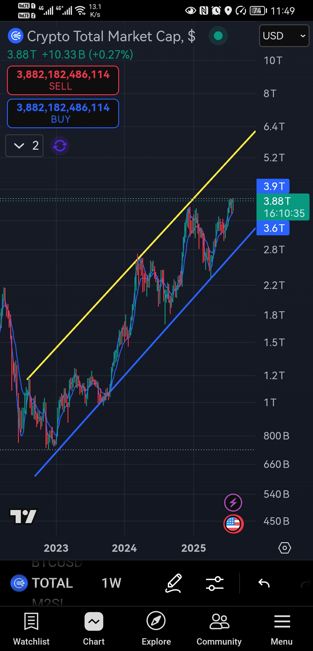 La capitalisation totale du marché crypto évolue dans un fort canal haussier, Bitcoin ayant déjà franchi la barre des 100 000 $ et se négociant près de 117 000 $. Ethereum a grimpé au-dessus de 4 000 $, soutenu par les entrées d'ETF et une forte pression d'achat.