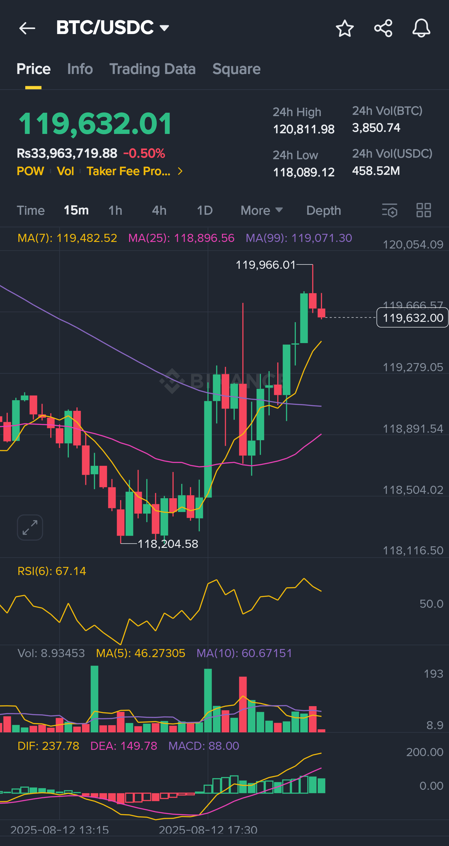 Le Bitcoin se nĂ©gocie autour de 119 700 $, se repliant lĂ©gĂšrement de ses rĂ©cents sommets prĂšs de 120 700 $. Le sentiment macro est mitigĂ© â les donnĂ©es CPI de juillet aux Ătats-Unis ont Ă©tĂ© supĂ©rieures Ă l'objectif de 2 % de la Fed, ce qui pourrait retarder les baisses de taux d'intĂ©rĂȘt. Cela renforce gĂ©nĂ©ralement le dollar amĂ©ricain et peut peser sur le BTC, mais les flux institutionnels et les mesures politiques soutenant l'adoption des cryptos ont aidĂ© le BTC Ă maintenir sa structure haussiĂšre.