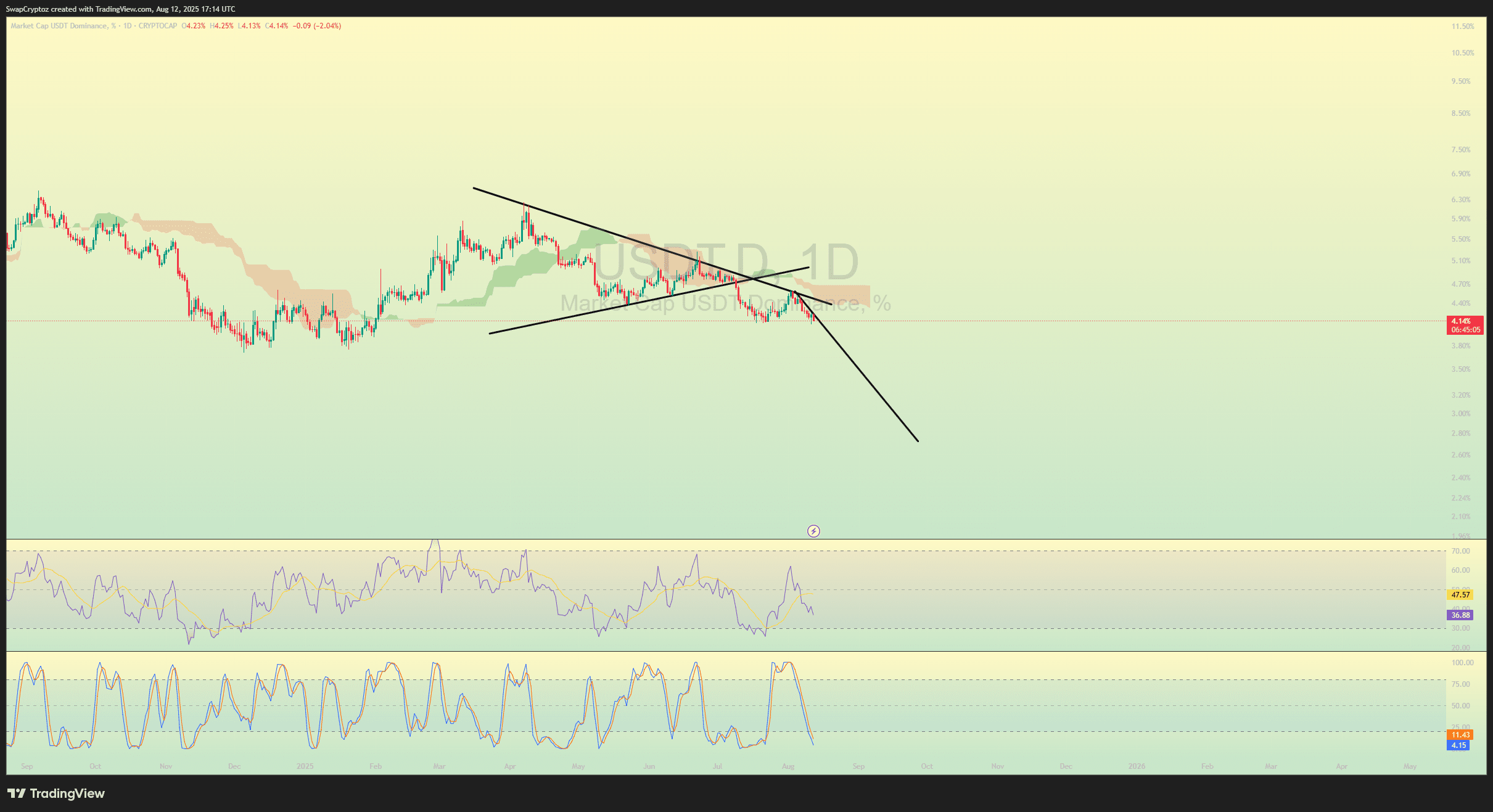 Ce graphique montre que la dominance de l'USDT est en tendance baissière, ce qui est un bon signe pour le marché des cryptomonnaies car cela suggère que de l'argent se déplace vers d'autres cryptomonnaies.