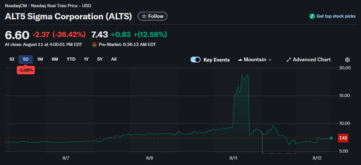L'action d'ALT5 Sigma était en forte hausse avant l'annonce, atteignant près de 20 $ dans le trading pré-marché, plus du double de sa valeur, selon les données de Yahoo Finance. Mais une fois la nouvelle tombée, l'élan a rapidement basculé alors que les actions chutaient, effaçant tous ces gains précoces et glissant de 26,42 % à 6,60 $ au moment de la clôture du marché lundi.