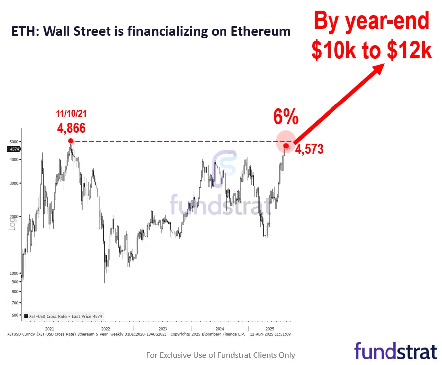Selon Lee et Sean Farrell, responsable de la recherche sur les actifs numériques chez Fundstrat, ETH pourrait grimper à 10 000 $ avant la fin de 2025. Ils ont ajouté qu'un momentum prolongé pourrait même pousser ETH aussi haut que 12 000 $ à 15 000 $.