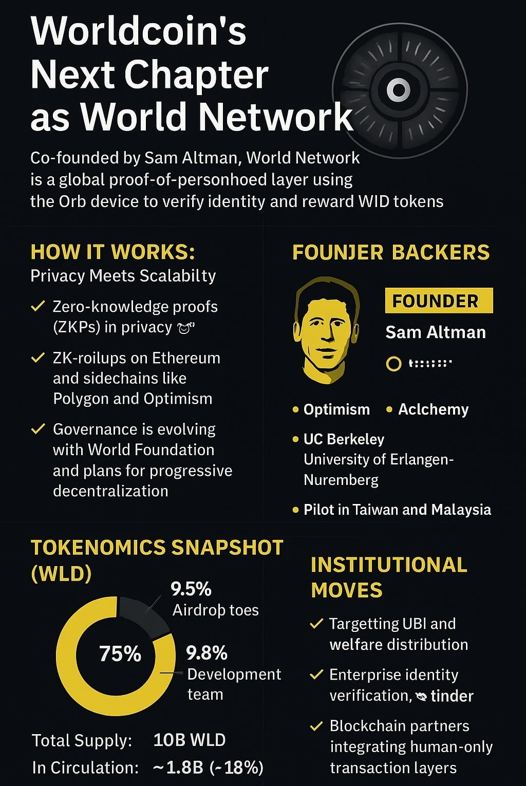 Worldcoin — maintenant en rebranding en World Network — n'est pas juste un autre token. Co-fondé par Sam Altman (oui, le gars d'OpenAI), il vise à devenir la couche mondiale de preuve d'identité pour l'économie numérique.