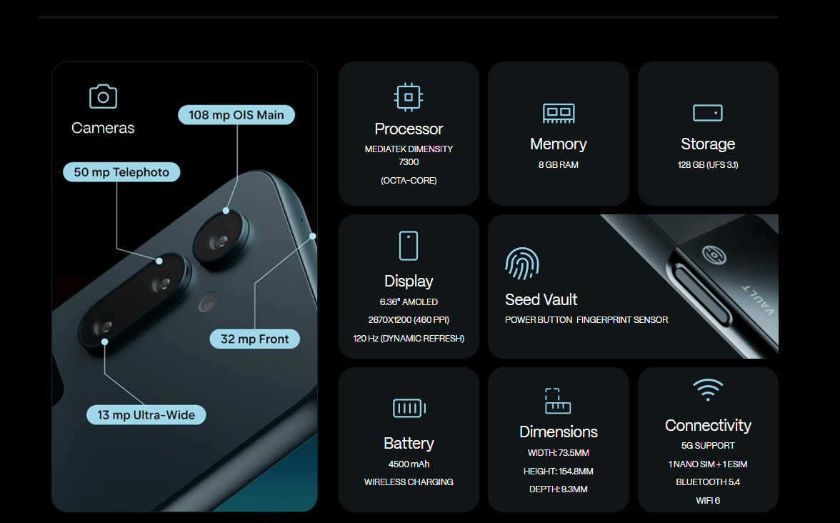 Les spécifications incluent un processeur MediaTek Dimensity 7300, 8 Go de RAM, 128 Go de stockage UFS 3.1, et un écran AMOLED de 6,36″ avec une résolution de 2670×1200 et un taux de rafraîchissement de 120 Hzsolanamobile.comCrypto.comsolanalabs.comHolder