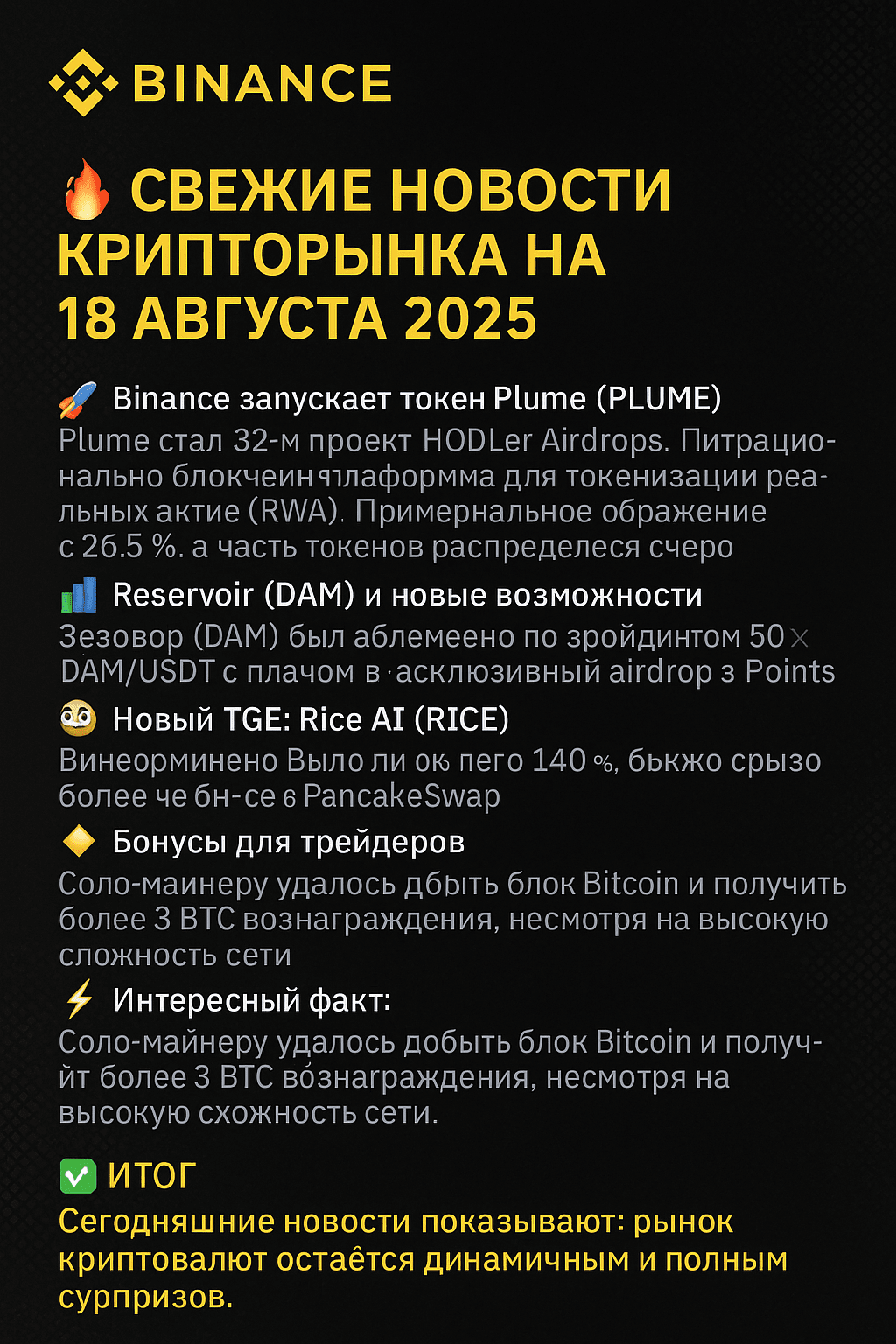 Les nouvelles d'aujourd'hui montrent : le marché des cryptomonnaies reste dynamique et plein de surprises. De nouveaux projets, tels que PLUME, DAM et RICE, ouvrent de nouvelles opportunités pour les investisseurs, et les actions de Binance rendent le trading encore plus avantageux. Malgré la correction des principales monnaies, le secteur DeFi continue de montrer sa force et une croissance soutenue.