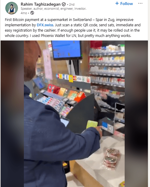 Ce développement fait suite à un événement marquant détaillé par Rahimt sur LinkedIn, qui a partagé la nouvelle du tout premier paiement en Bitcoin effectué dans un supermarché en Suisse. Rahimt a loué l'innovation, en soulignant le potentiel des cryptomonnaies dans les transactions quotidiennes.