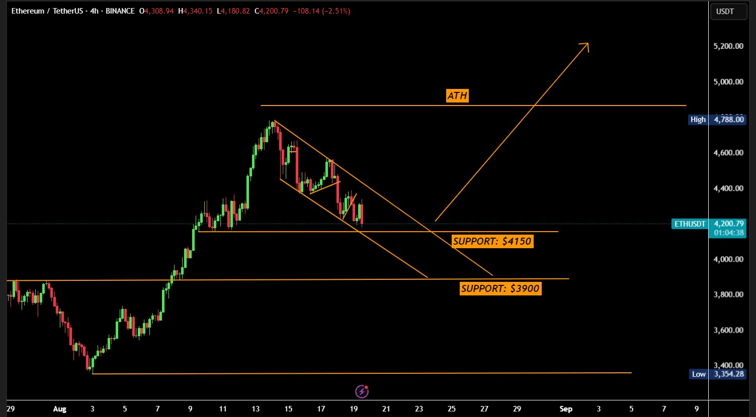 Si le support à 4 150 $ tient, l'ETH pourrait tenter une rupture du canal et tester la résistance de 4 788 $ / zone ATH.