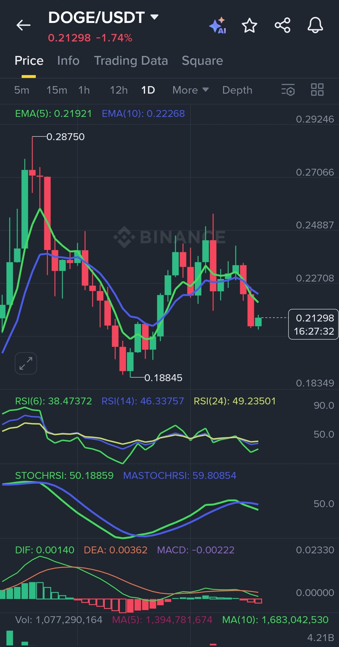 Le prix actuel de DOGE est d'environ 0,2130 $, ayant diminué d'environ 2 % au cours des dernières 24 heures.