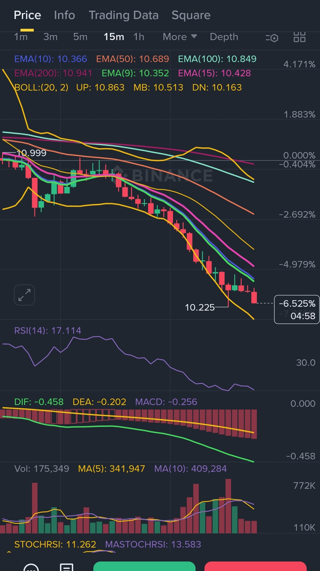 · MACD : La ligne MACD (DIF) est nĂ©gative et en dessous de la ligne de signal (DEA), confirmant l'Ă©lan baissier. Cependant, l'histogramme essaie de converger (par exemple, -0,304 -> -0,081 -> -0,101). C'est une divergence haussiĂšre potentielle ! L'Ă©lan de la tendance Ă la baisse ralentit. â ïž