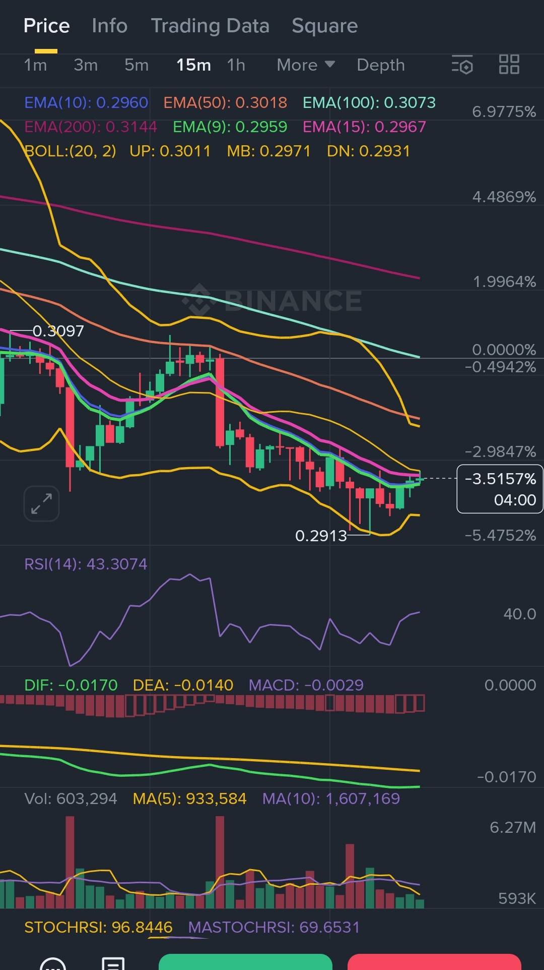 · L'Histoire : Le prix se nĂ©gocie AU ou EN DESSOUS de tous les EMAs majeurs. La tendance est baissiĂšre, sans aucun doute. Mais regardez les Bandes de Bollinger ! Le prix presse la BANDE INFĂRIEURE (0,290 $ - 0,293 $). C'est une zone de support classique oĂč les rebonds naissent.