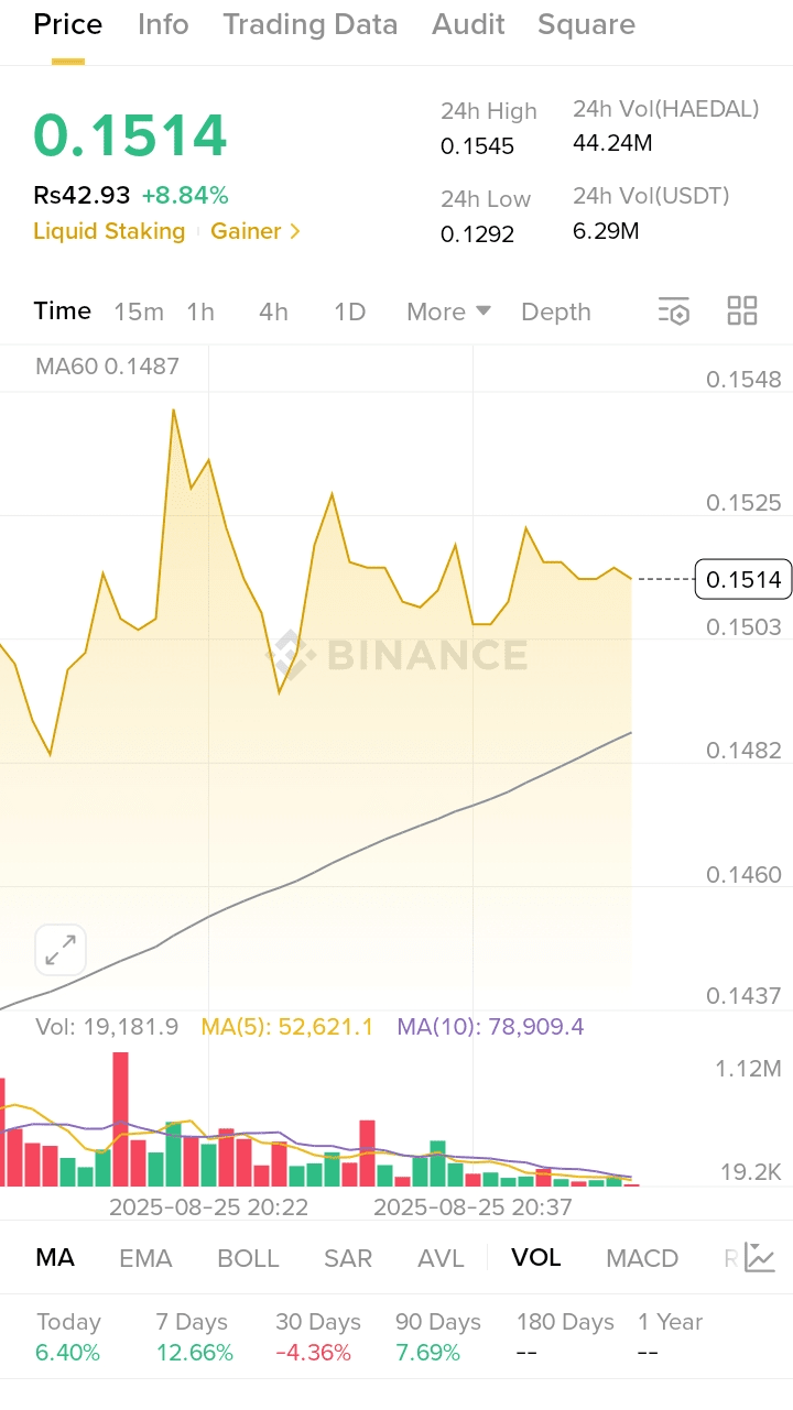 Ce qui rend cette configuration si excitante, c'est le fort volume d'achats soutenant le mouvement. Les indicateurs d'élan pointent vers une force continue, suggérant que $HAEDAL pourrait se préparer à sa prochaine jambe de rupture. Tant que le prix reste au-dessus du support, le biais reste fermement haussier.
