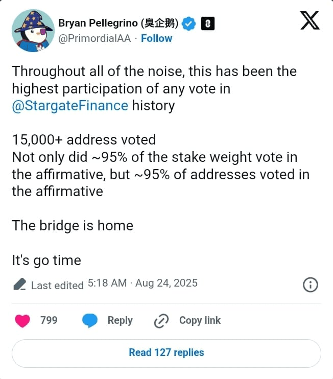 Plus de 15 000 adresses de portefeuille ont voté, avec 94,76 % (7,2 millions de jetons STG) soutenant l'offre de LayerZero, tandis que 5,24 % (399 400 jetons) ont voté non, faisant de cela le plus grand vote de Stargate jamais enregistré, selon le PDG de LayerZero, Bryan Pellegrino.