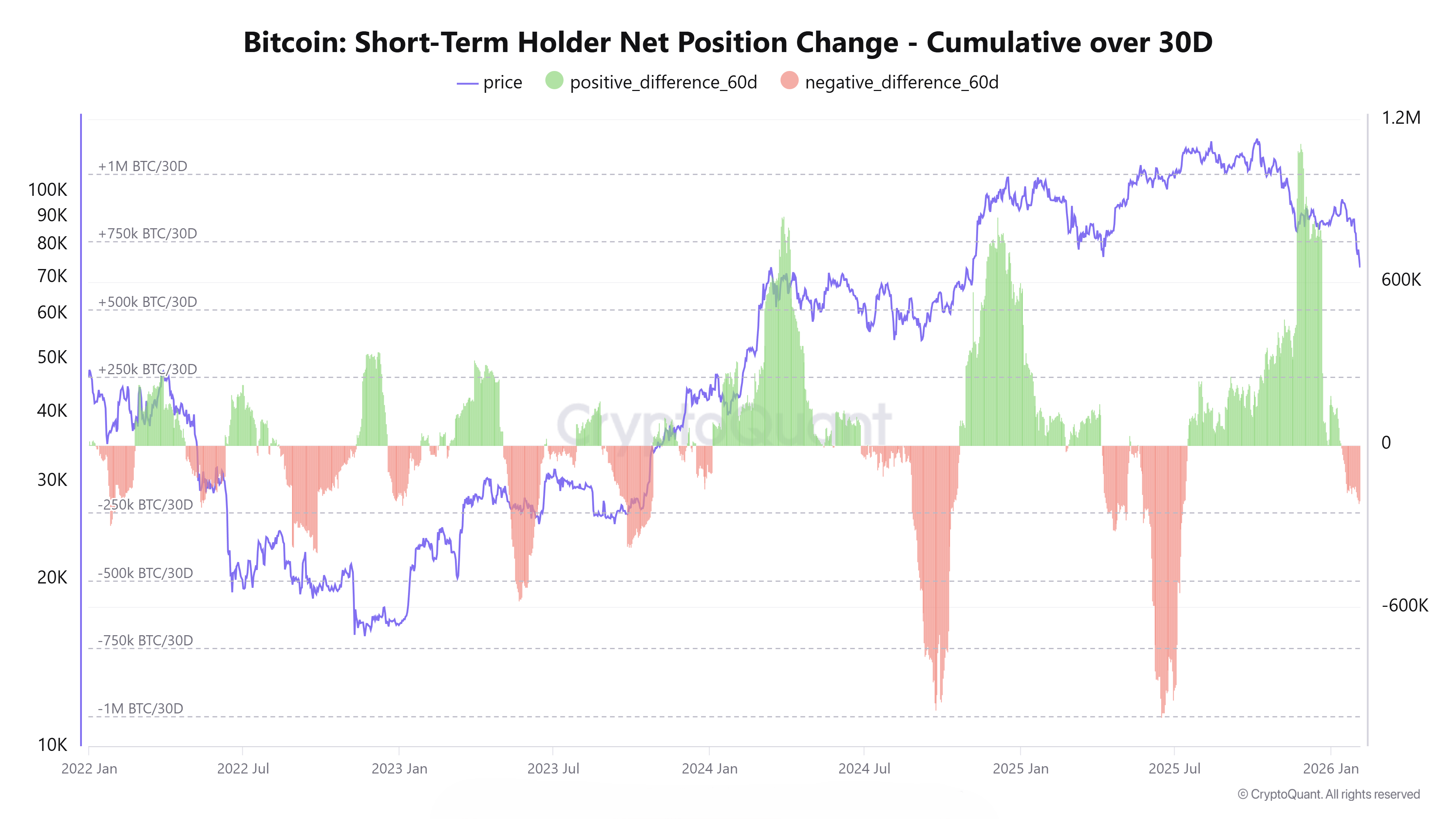 Le changement de position nette des détenteurs à court terme vient de basculer après une forte phase d'accumulation, avec la métrique cumulative sur 30 jours qui retombe dans le rouge. Ce changement signale une nouvelle offre entrant sur le marché alors que les acheteurs récents commencent à réaliser des profits ou à réduire les risques.