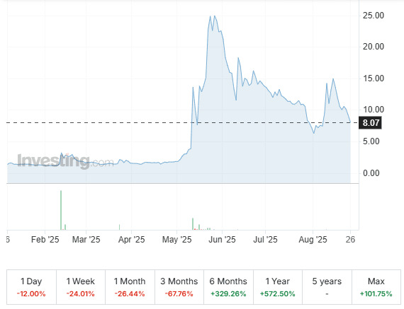 Les investisseurs ont réagi prudemment à la décision d'investissement en Bitcoin de KindlyMD. L'action NAKA a chuté de 12 % mardi et a encore baissé de 2,7 % dans les échanges après les heures d'ouverture à 7,85 $, bien qu'elle se soit depuis légèrement redressée à 8,07 $ (actuel). Même après la récente baisse, les actions de l'entreprise sont toujours en hausse de 330 % depuis mai et de 550 % cette année en raison de l'excitation autour de son plan d'actif doré.