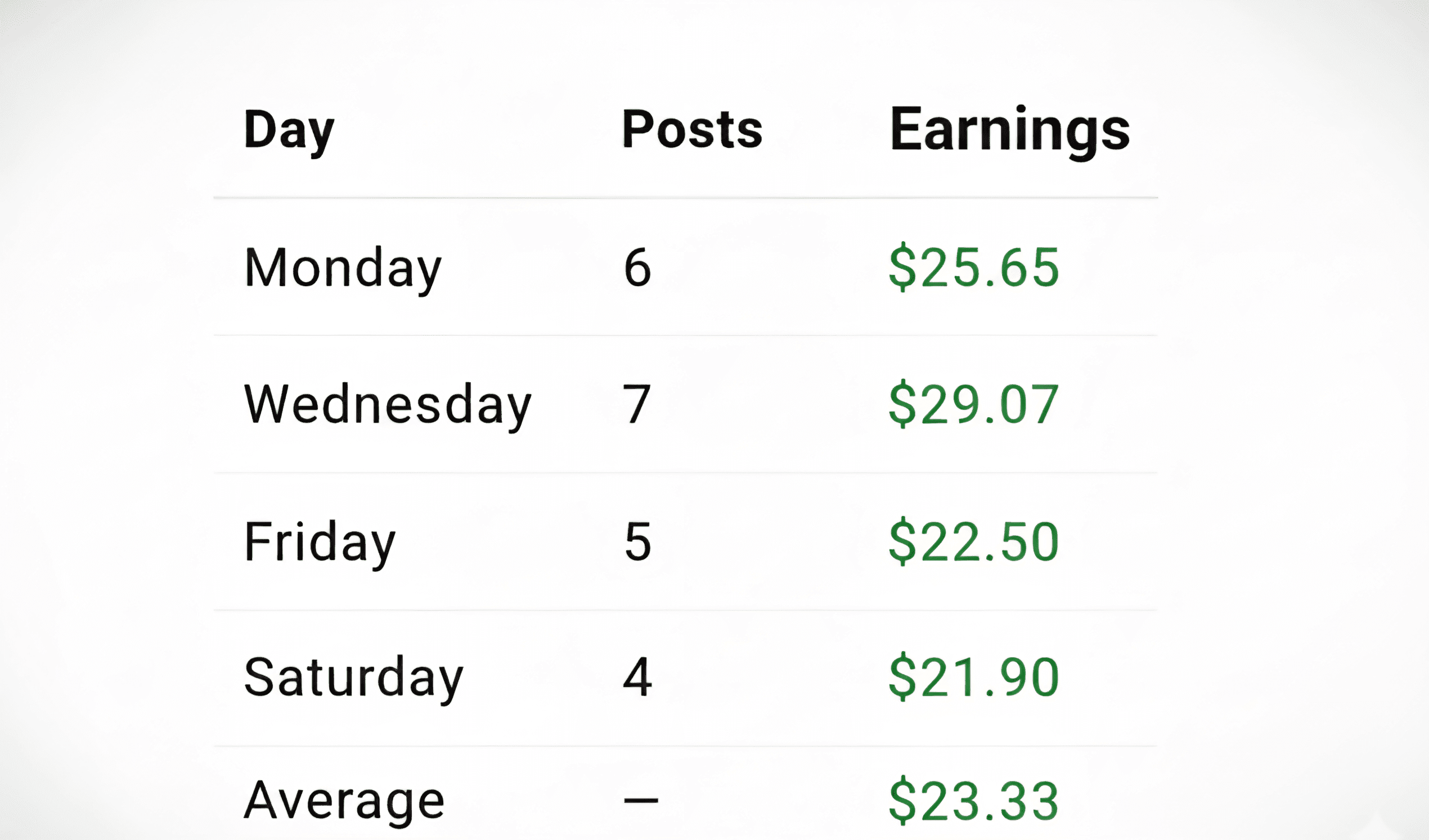 Publier environ 4 à 6 bonnes publications par jour peut vous garantir de bons bénéfices. Si chaque publication reçoit une bonne interaction, vous pouvez gagner de 3 à 4 dollars par publication, ce qui vous amènera facilement à environ 20 dollars par jour.