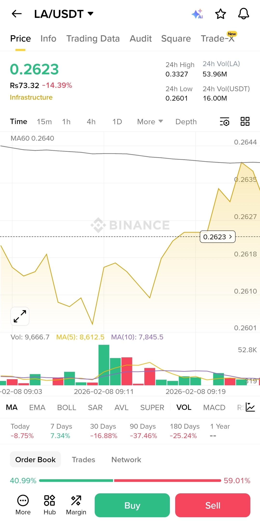 Recent market sentiment around LA suggests increased volatility due to infrastructureârelated token regulatory news. Traders are advised to watch the Depth and TradeâX features for liquidity shifts. An emerging trend is the use of AIâdriven analytics (visible in the AI icon) to predict bounceâbacks from support levels like MA60, which could present a shortâterm buying opportunity if the price stabilizes above 0.2640.