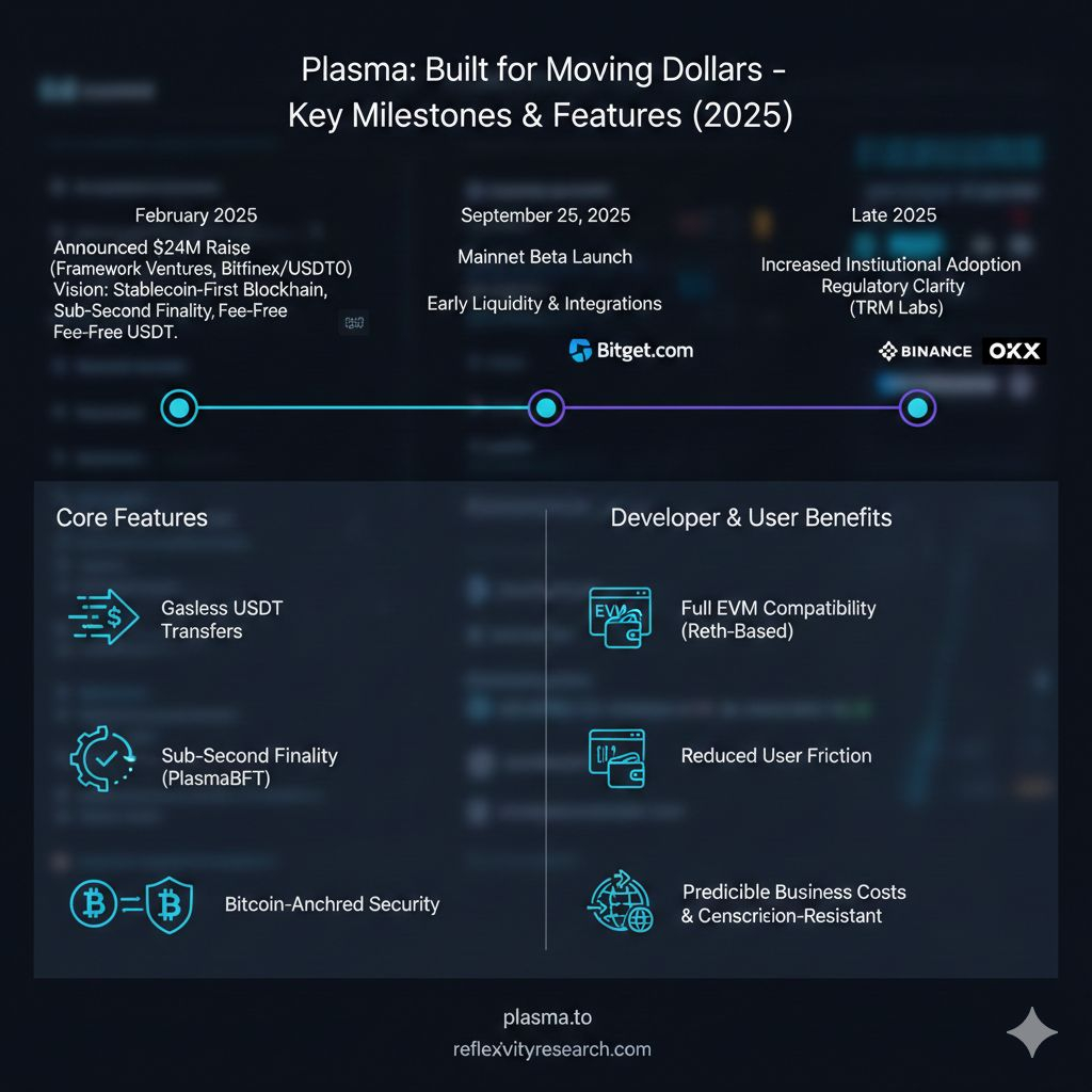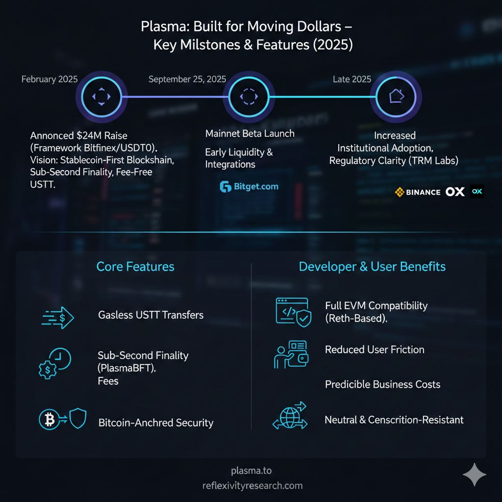 If you’re looking for what changed in 2025, the project started showing real shape instead of just narrative. Plasma announced a $24M raise in February 2025 led by Framework with participation from Bitfinex/USDT0, explicitly framed around building a stablecoin-first blockchain with sub-second finality and fee-free USDT transfers. � Later in the year, mainnet beta was reported as launching on September 25, 2025, with early liquidity and integrations arriving quickly—exact figures vary by source, but the signal was clear: Plasma was positioning itself as a serious USDT settlement venue rather than a demo chain. �