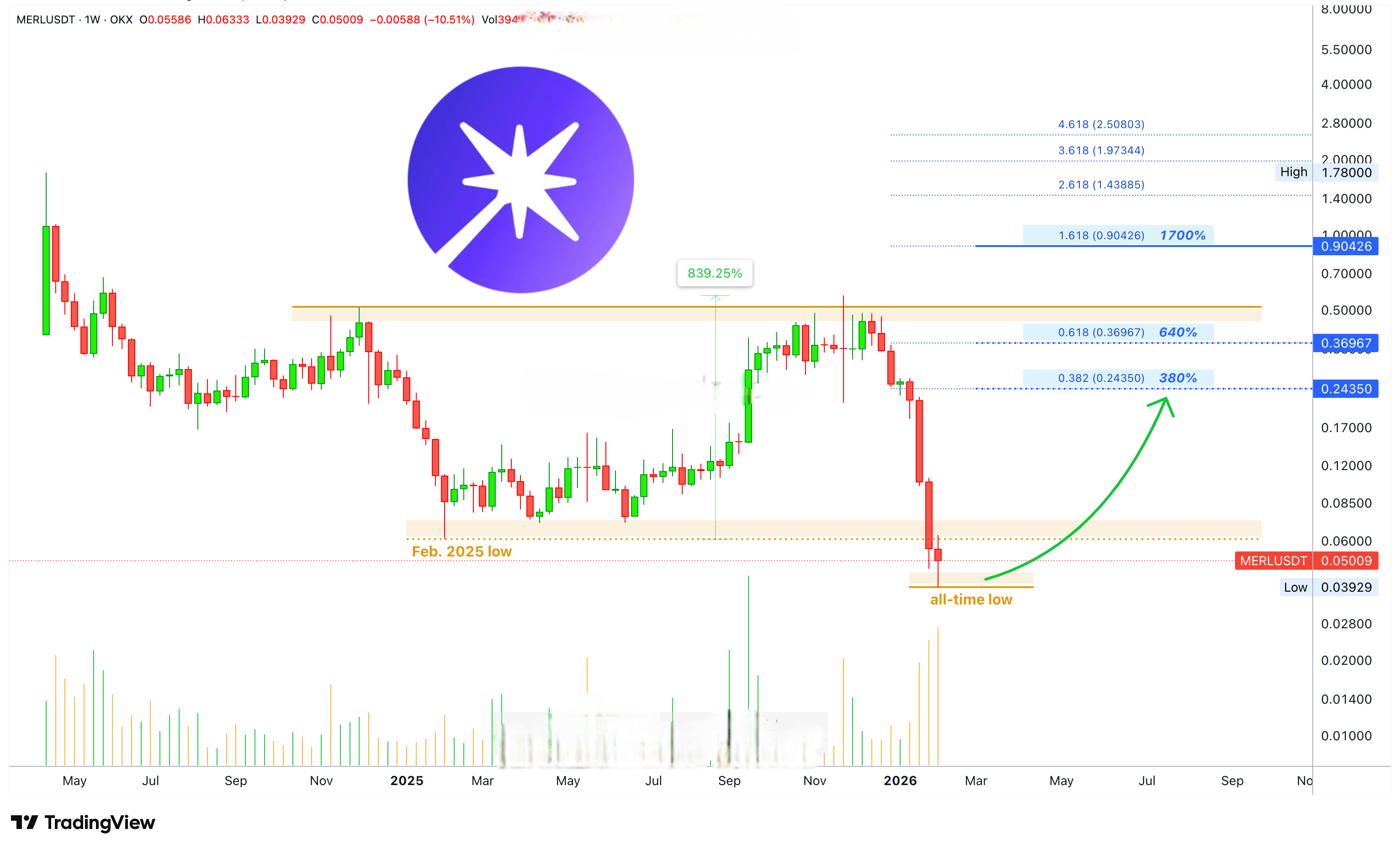La vague haussière suit une vague baissière. Après le sommet de novembre 2025, MERLUSDT a connu un effondrement majeur et un nouveau plus bas historique. La même séquence peut se répéter.