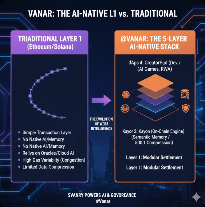 What makes Vanar fundamentally different is that it doesn't treat AI as an add-on or a marketing buzzword. Its architecture is built around a specialized 5-layer stack designed to solve the two biggest hurdles for decentralized AI: Memory and Reasoning.