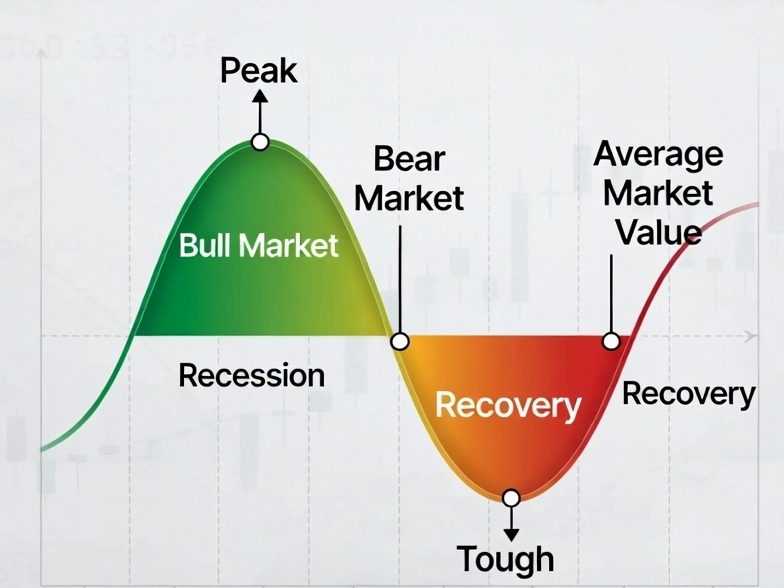 Bear phase: Prices fall, fear dominates, and many sell in panic. It clears weak hands from the market, preparing the ground for the next accumulation.