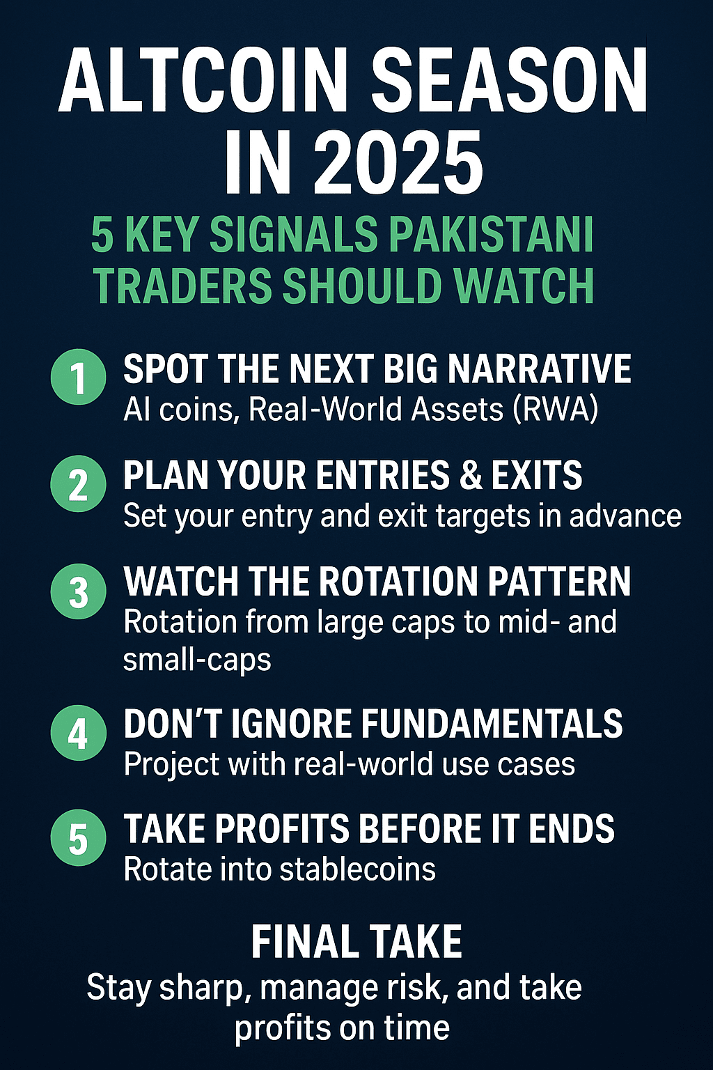 Pour les traders pakistanais, la saison des altcoins peut être une mine d'or — mais seulement si vous êtes préparé. Restez vigilant, gérez le risque et prenez des profits à temps afin que la vague vous porte en avant, et non en dessous.