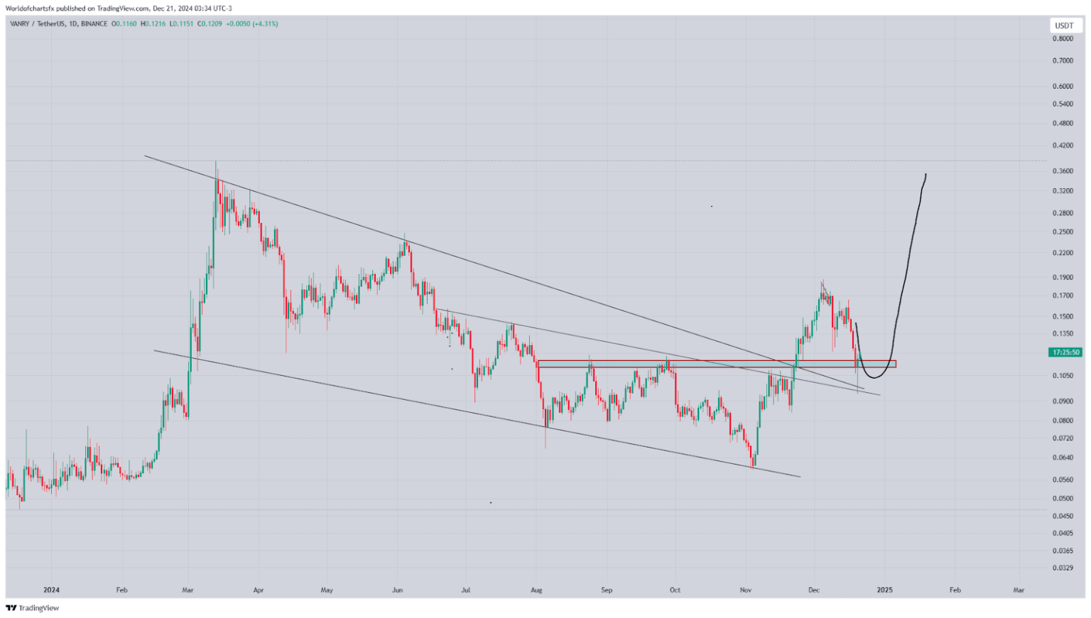 VANRY bullish setup signals potential recovery. After breaking out of a prolonged descending channel in late 2024, the token’s price hit a peak of $0.17. However, it retraced to a critical support level at $0.12. Analysts expect a rebound toward the .25–$0.30 range as bullish interest surges.