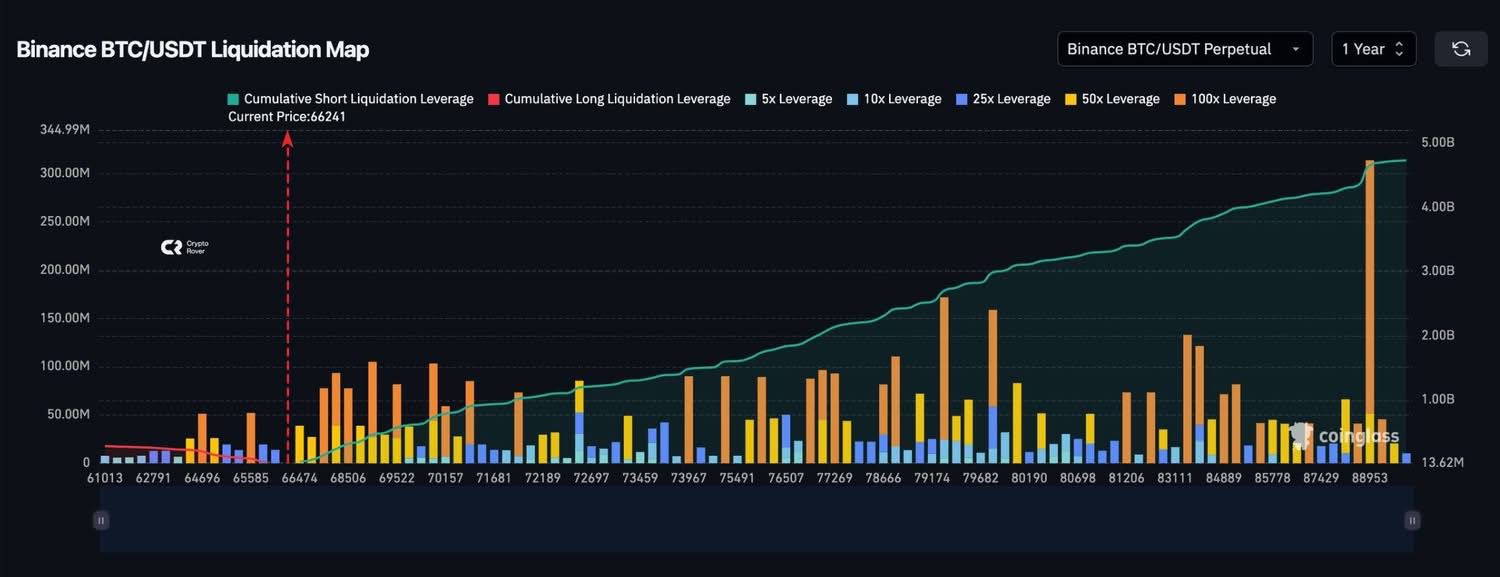🔸La zone de prix juste en dessous de 66k–65k a déjà accumulé beaucoup de liquidité Long (les histogrammes rouges longs et épais).
