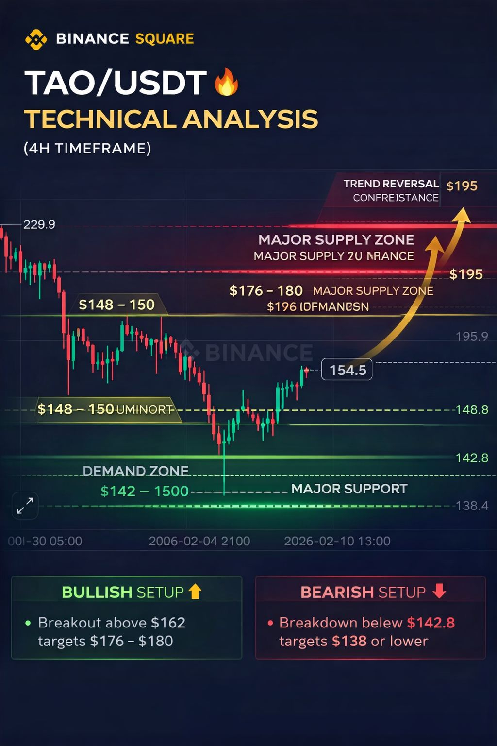 $TAO is currently trading near $154.5, recovering from the recent swing low at $142.8. On the 4H timeframe, the broader structure still shows a bearish trend with lower highs and lower lows. However, price is now attempting a short-term rebound after tapping a strong demand zone, signaling that volatility expansion may be near. This area is acting as a decision zone for the next directional move.