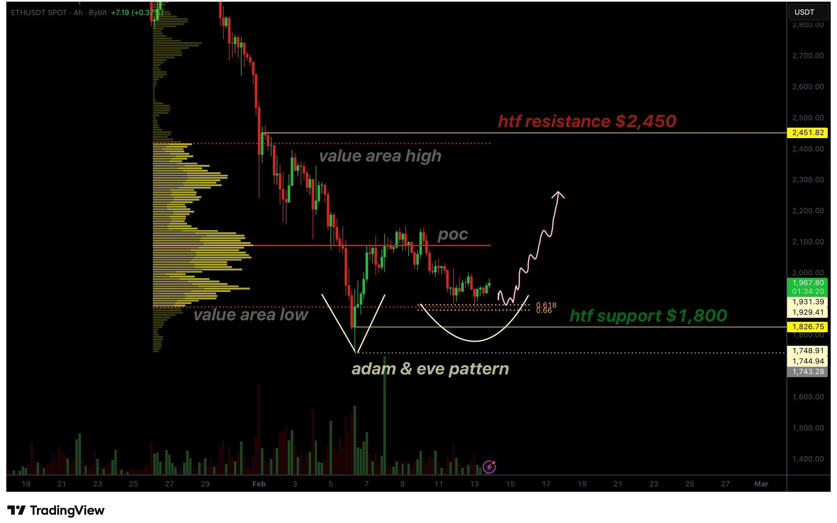 D'un point de vue technique, de l'action des prix et de la structure du marché, Ethereum semble être dans les premières étapes d'un processus potentiel de formation de creux. Tant que le prix reste au-dessus du récent plus bas près de 1 740 $, le modèle Adam et Eve reste valide.