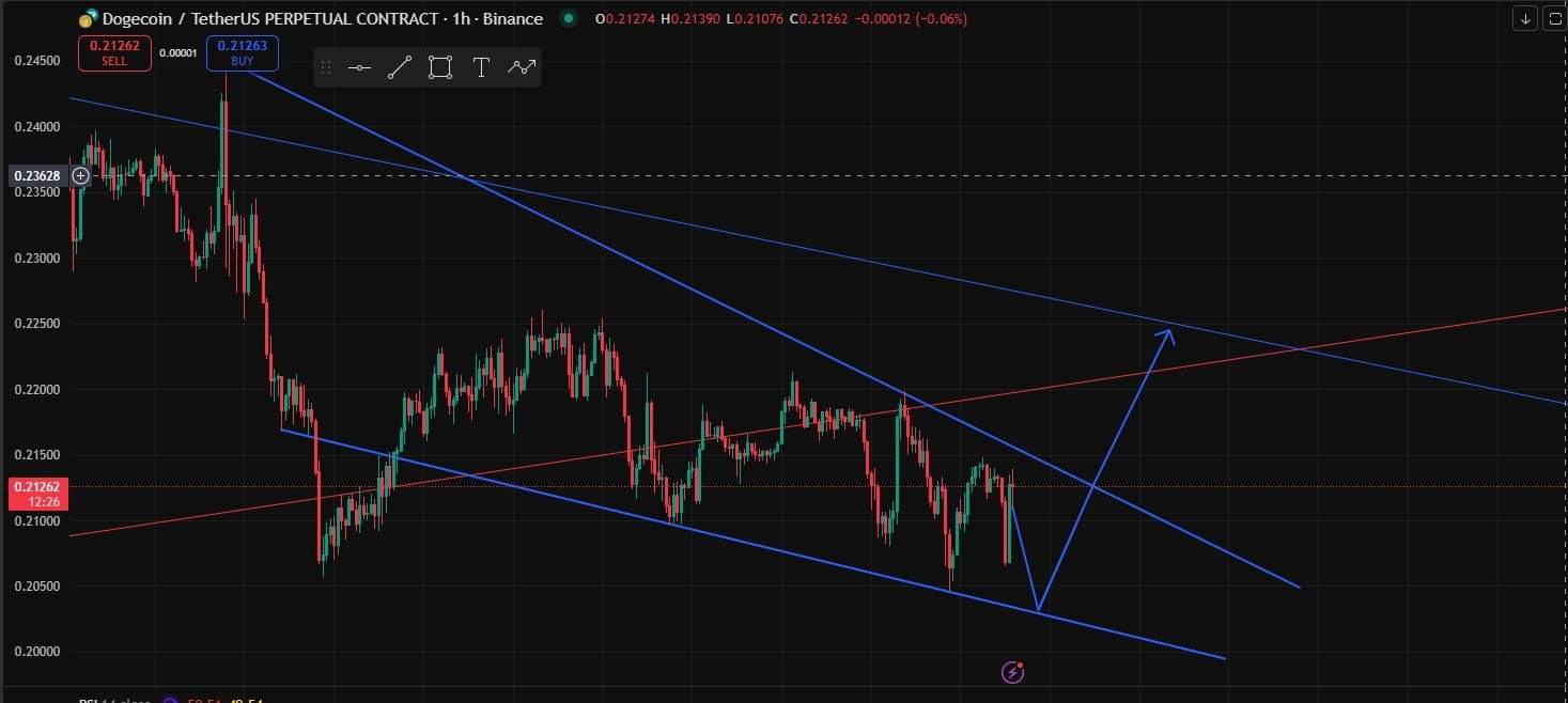 Le graphique forme un motif de coin descendant (marqué par des lignes bleues).