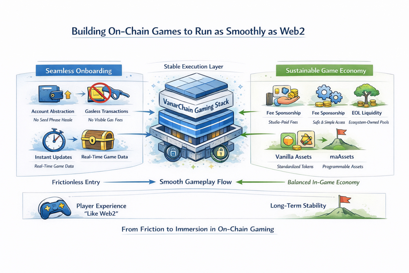 And then I started reading about VanarChain in the middle of that same looped question. If you want an on chain game to feel smooth, what pieces do you actually need, and in what order do you assemble them. VanarChain’s gaming stack made me pause because it didn’t start with the slogan of high TPS. It started with something very human. The path from downloading the game to entering a match has to be frictionless, like sliding on ice. Onboarding has to be invisible, or nearly invisible. The wallet can’t be a psychological barrier. Fees need to be handled so players don’t feel like they’re paying gas. And in game state, items, scores, match results, must update fast enough that players never feel yanked out of flow.