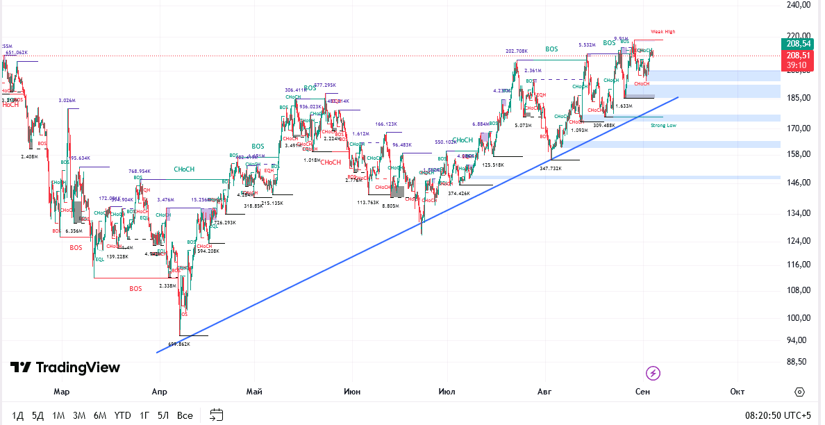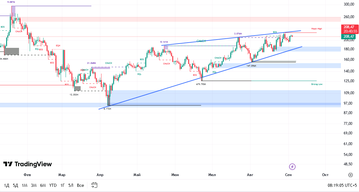 Sur le graphique horaire, $SOL maintient sa position au-dessus d'une ligne de tendance haussière clé, qui sert de base au rallye actuel, commencé à partir de 120 $. Cette ligne de support coïncide avec la moyenne mobile exponentielle (EMA) sur 200 périodes autour de 190 $, ce qui crée une forte base technique pour la poursuite de la hausse.